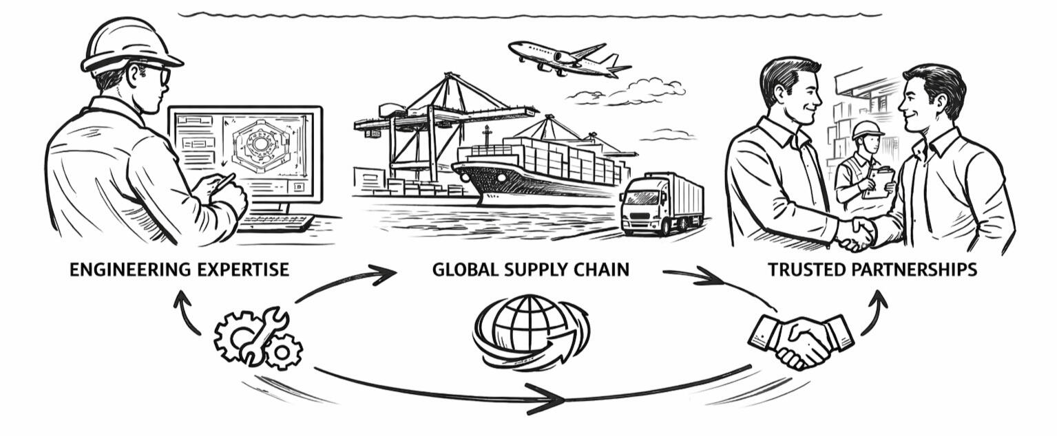 依托行业经验与优质中国制造商的深度合作,AIO Engineering 打造了“工厂对工厂”的直连模式。我们不仅是渠道,更是技术把关者与长期合作伙伴。